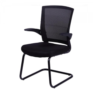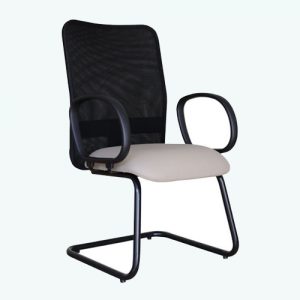 Poltrona diretor fixa com braços articuláveis, assento estofado em espuma injetada de alta densidade com revestimento em tecido preto e encosto em tela, base fixa modelo continua.