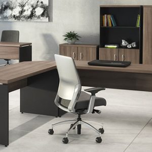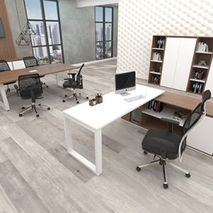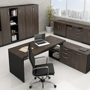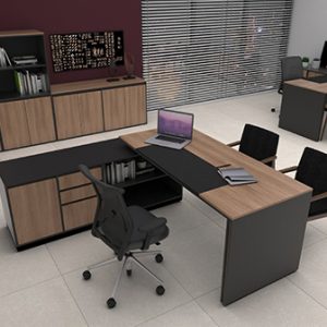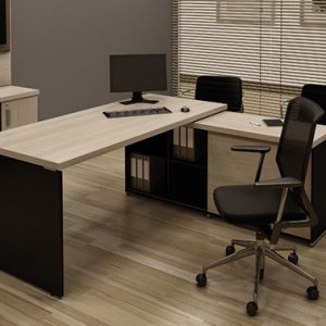 Mesa executiva reta com tampo em mdp encabeçado de 40mm, pés fechados modelo painel, armário credenza com 01 porta de correr encaixado por baixo do tampo, medindo: 1,60 x 1.60m ou 1,80 x 1.80m, consultar outras opções de medidas, cor dos tampos a definir.