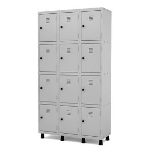 Roupeiro de aço com 12 portas pequenas, medindo 1.98 x 1.04 x 0.40m (alt x larg x prof) com sistema de pitão para cadeado, pintura eletrostática na cor cinza.