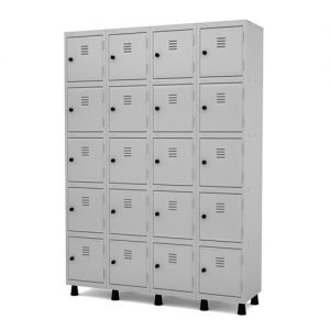 Roupeiro de aço com 20 portas pequenas, medindo 1.98 x 1.34 x 0.40m (alt x larg x prof) com sistema de pitão para cadeado, pintura eletrostática na cor cinza.