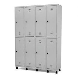Roupeiro de aço com 04 portas pequenas, medindo 1.98 x 0.34 x 0.40m (alt x larg x prof) com sistema de pitão para cadeado, pintura eletrostática na cor cinza.