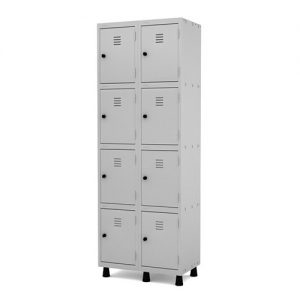 Roupeiro de aço com 08 portas pequenas, medindo 1.98 x 0.69 x 0.40m (alt x larg x prof) com sistema de pitão para cadeado, pintura eletrostática na cor cinza.