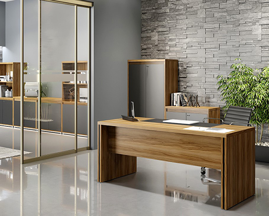 Mesa executiva reta com tampo duplo em mdp 36mm, acabamento central com bivard em couro ecológico, pés fechados tipo painel, medindo: 1,60 x 0,70m ou 1,80 x 0,70m, consultar outras opções de medidas, cor dos tampos a definir. (sem gavetas).
