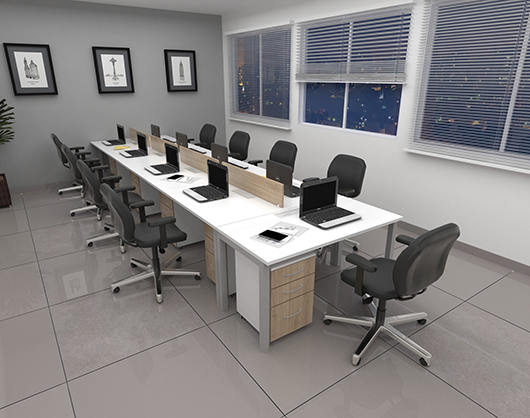 Plataforma de trabalho estrutura em aço com caixa de conectividade individual e painel divisor frontal, dotada de posto para supervisor, quantidade de lugares, cores e medidas a consultar.